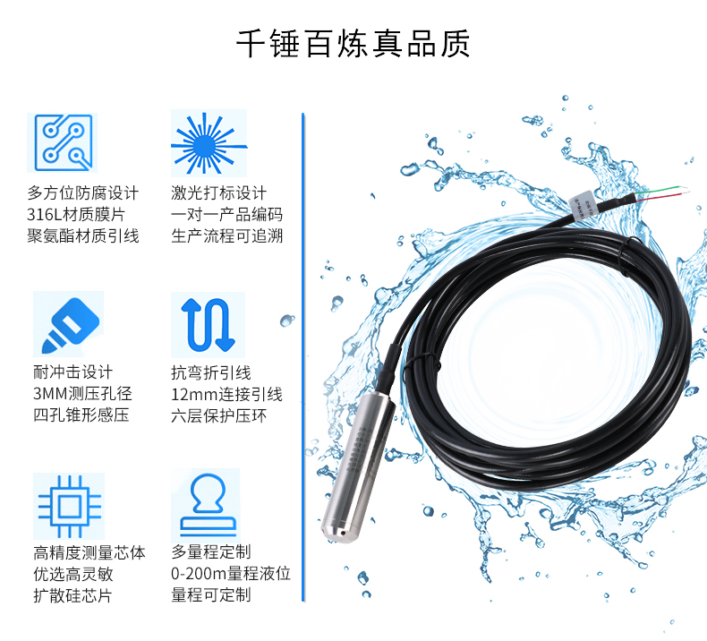 SIN-P261投入式液位變送器由高性能擴散硅壓阻式壓力傳感器作為測量元件,把與液位深度成正比的液體靜壓力準確測量出來,并經(jīng)過信號調(diào)理電路轉(zhuǎn)換成標準(電流或電壓)信號輸出,建立起輸出信號與液體深度的線性對應(yīng)關(guān)系,實現(xiàn)對液體深度的測量。產(chǎn)品精度高、體積小,直接投入液體中,即可測量出變送器末端到液面的液體高度,使用方便。適用于石油、化工、電廠、城市供水、水文勘探領(lǐng)域的液位測量與控制。經(jīng)過長期老化及穩(wěn)定性篩選,產(chǎn)品性能穩(wěn)定可靠,能夠適用應(yīng)用于環(huán)境比較惡劣的露天現(xiàn)場,同時能夠現(xiàn)場液位顯示,零點,滿程可遷移。